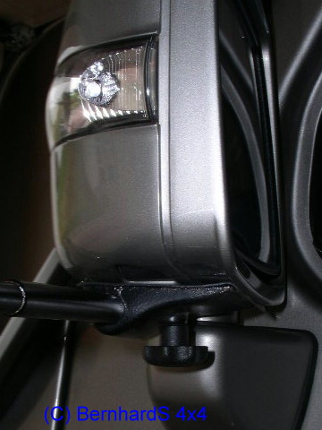 BernhardS (viermalvier) baute für den G270CDI die Halterung um (DC-Spiegel B67816410). Er entfernte die vordere Kante an der Halterung und verlängerte die Spiegelstange um 10 cm. |