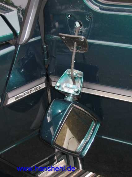 ![]() Dieser Spiegel besitzt noch nicht die Vorfeldbeleuchtung. Der Zusatzblinker (hier in farblos) ist noch an der Seite angebaut (seit 1979 gleiche Bauweise wie beim 240GD, siehe hier. |
