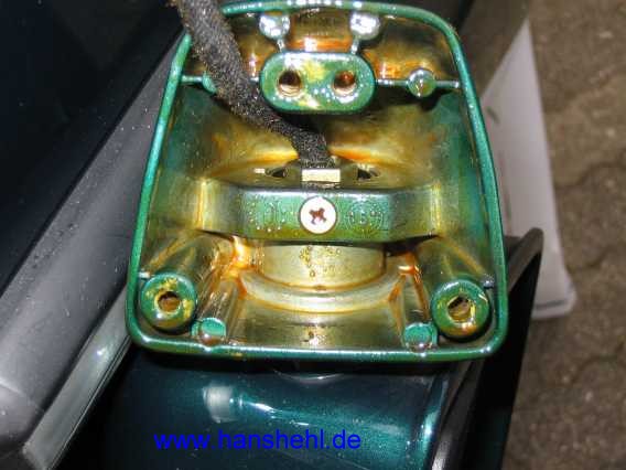 Auch beim G55AMG (2/2006) ist im Oktober 2007 diese Korrosion im Spiegelfuß vorhanden. Die weißen Oxidschichten auf dem Aluminium kann man abkratzen oder abschleifen. |
