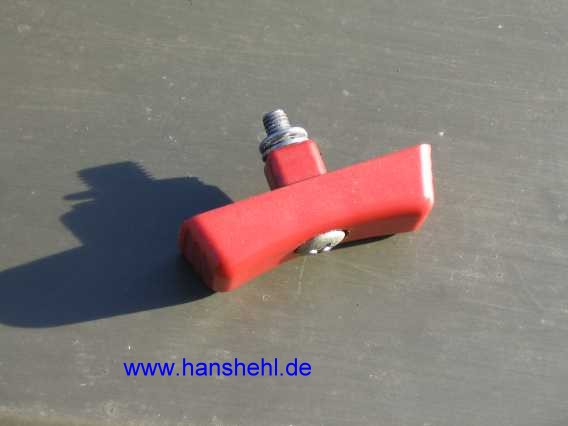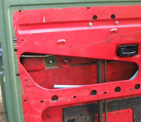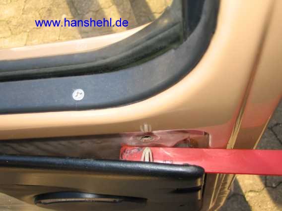 | Auch der rote Riegel der Türinnenverriegelung wird abgeschraubt, ohne die Abstandsscheibchen zu verlieren. Diese verhindern ein Schleifen an der Verkleidung. | ![]() |