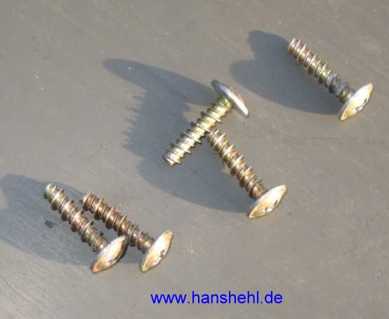 | Die Türschale ist beim 240GD/1979 an der Tür noch mit 6 Spezialschrauben und Kunststoffdübel befestigt. Inzwischen gibt es auch Gummistöpsel mit M4-Gewindebuchsen mit metrischem Gewinde. | ![]() |