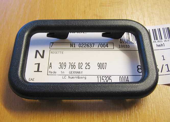 | Zum Ausbau der Fensterkurbel wird die Kunststoffeinlage A1267680036 in Pfeilrichtung abgezogen. Die halbrunde Aussparung hält die Kurbel in der Nut der Achse. | ![]() |
