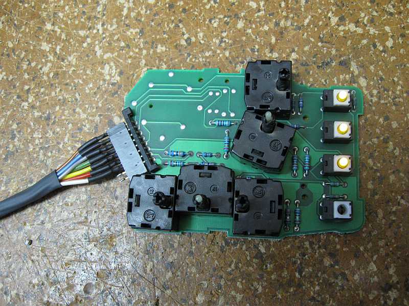 Der Schaltplan des Türsteuergerätes enthält auch die Verbindungen zur Schaltergruppe. Den Tasterbetätigungen entsprechen bestimmte Widerstandswerte nach Masse. Die Werte werden spannungscodiert über die Eingangskanäle A,B,C (D nur mit Lenksäulenbetätigung) an das Türsteuergerät übermittelt. Über den Innenraum-CAN-Bus B werden vom Türsteuergerät über das Sitzsteuergerät die Motoren im Sitz angesteuert. Mit einer Flachbuchsenleiste kann man sich für das Tasterfeld einen Steckadapter bauen. Oder man nimmt den originalen Stecker. Die drei Leuchtdioden der Speicherplatz-Tasten sind an Kl. 58d ( ST1: regelbare Instrumentenbeleuchtung, ST5 Masse) angeschlossen und leuchten hell mit 12 V. |