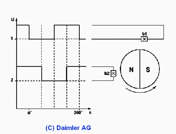 Dreht sich der Motor, liefern die Hallgeber entsprechend ihrer räumlichen Anordnung zueinander zeitlich versetzte Rechtecksignale. siehe auch Positionserkennung Fensterhebermotor R230: Die Auswertung der Frequenz und der Länge der beiden Rechtecksignale ergibt unter Berücksichtigung der Drehrichtung die Drehzahl des Motors (Öffnungs- bzw. Schließgeschwindigkeit des Fensters), Bewegungsrichtung, Position der Scheibe und ermöglicht einen Einklemmschutz. |
