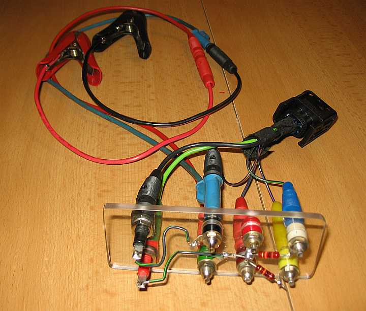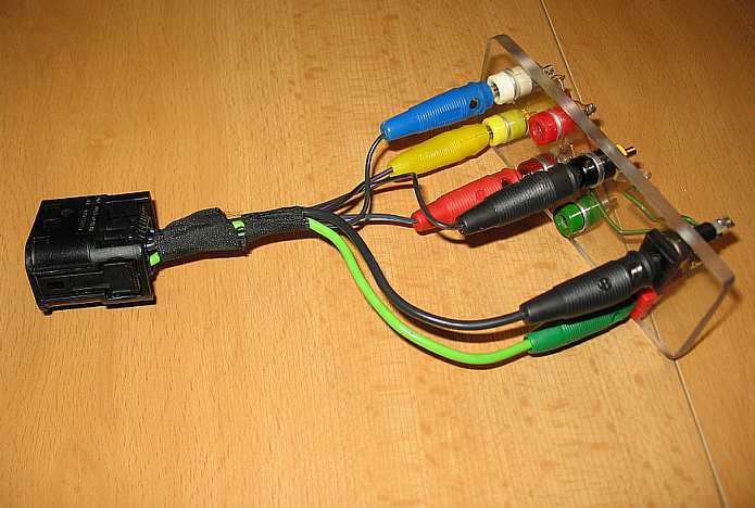 Eine Buchsenplatte mit den Widerständen vermeidet den Kabelverhau. Polycarbonat eignet sich sehr gut und ersetzt das früher übliche Pertinax. Es läßt sich wie Metall sägen, bohren und schleifen. Es fehlen jetzt noch zwei Taster für die Laufrichtungen des Motors. |