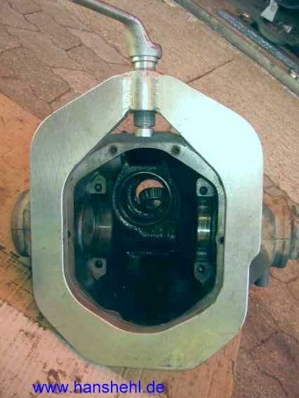 Werkzeug W460589053100 (Preis 01.04.2014): Achse 741.1/13/2/4/5/6, 742.6 Damit man das Tellerrad ausbauen kann, muß das Differenzial-Gehäuse seitlich gestaucht werden. Es gibt von Mercedes ein Sonderwerkzeug W460589053100, siehe auch WS35.00-N-3139C - 190,35 (alt: 368,90) Euro ohne MwSt., (alte Nummer W601589003100 - 430,46 Euro inkl. 19% MwSt.). Mit einem Ringschlüssel (27 mm) und einer Verlängerung (etwa 1m) wird mit etwa 2 Umdrehungen der Schraube das Gehäuse zusammengedrückt, damit man die Lager entnehmen kann. siehe AR33.30-P-0432GX (Suchwort z.B. Tellerrad) |
