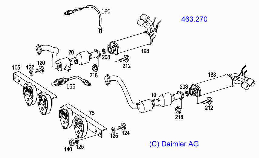 Auspuffanlage G55AMG: 463.270: EPC-Net: Gruppe 49/212/4 Teile 463.270: Bild-Nr.155: Sonde vor KAT: A0015407917 Bild-Nr.160: Sonde nach KAT: A001547417 |