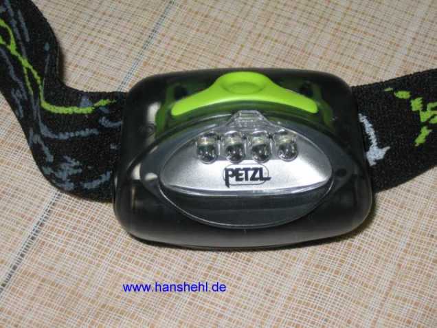 | Sehr praktisch ist bei nächtlichen Pannen eine LED-Kopflampe mit Stirnband, z.B. die TIKKA PLUS von Petzl mit dreijähriger Garantie. Die Leuchtstärke der 4 Leuchtdioden mit 35 Lumen ist in drei Stufen regelbar und als Blinklicht schaltbar. Drei kleine AAA-Batterien reichen 100 Stunden bei voller Helligkeit. | ![]() |