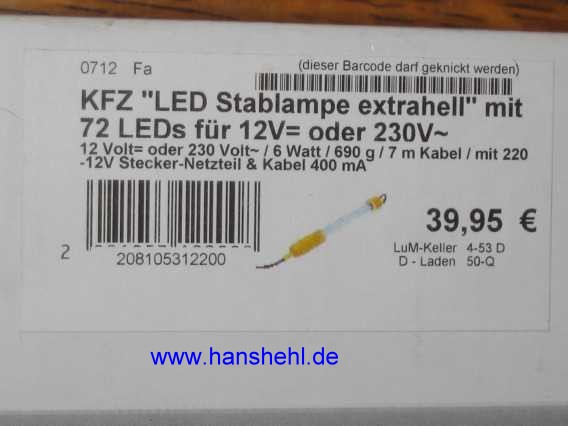 | Bei Amazon.de gab es eine Akku-LED-Leuchte von Isotronic, Nr. 43942 mit 61 LED. Sie enthält keine Suchleuchte, die braucht man auch nicht. |
