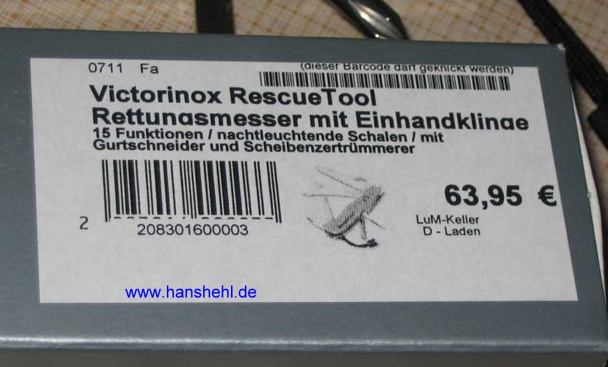 | Ein Lebensretter kann das Rescue Tool der Schweizer Firma Victorinox sein. 1 = Feststellklinge, 2 = Gurtschneider, 3 = Scheibenzertrümmerer, 4 = Frontscheibensäge für Verbundglas, 5 = Starker Schraubendreher, 6 = Kreuzschlitz-Schraubendreher, 7 = Stech-Bohrahle von Fa. Därr. | ![]() |