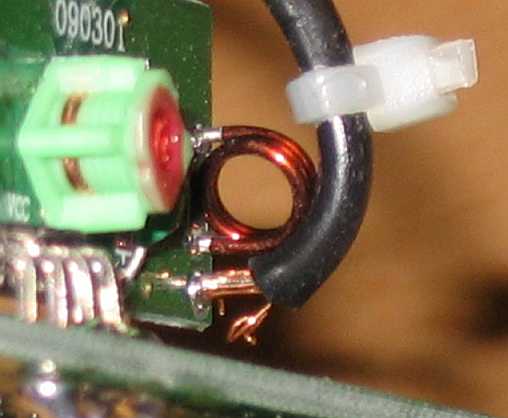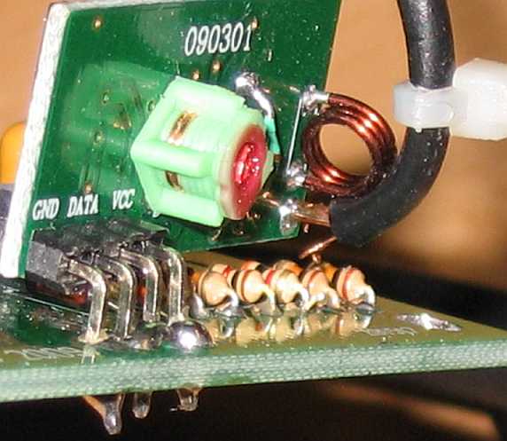 | Vom Antennendraht sind einige Drähtchen nicht angelötet und könnten einen Kontakt mit den darunter liegenden Widerständen bekommen. Die Bezeichnungen der Chips und Transistoren sind abgeschliffen, um einen Nachbau zu erschweren, was sich aber bei dem Verkaufspreis nicht lohnt. Es gibt aber ähnliche Module bei der Fa. Conrad einzeln (433MHz Fernsteuerung). | ![]() |