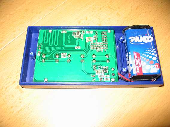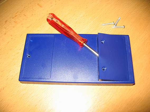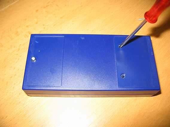| Eine mitgelieferte 9-Volt-Batterie übernimmt die Stromversorgung. Allerdings läßt sich der Deckel des Batteriefaches nach dem Lösen der beiden Schrauben nur mit einem Schraubendreher abhebeln. | ![]() |