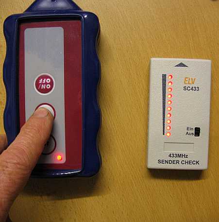 Mit einem 433MHz-Tester kann die Tastenfunktion IN/OUT und die Sendeleistung geprüft werden. |