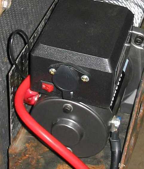 | Der Empfänger (Relaiseinheit) wird anstelle des Kabels der Handfernbedienung an die Steckdose am Relaiskasten der Seilwinde gesteckt. Ein zusätzlicher Masseanschluss für die Stromversorgung des Funkempfängers ist mit der Greifklemme notwendig. Am dreipoligen Fernbedienungsstecker liegen nur die + 12 Volt an (siehe Drehrichtungsumschaltung). | ![]() |