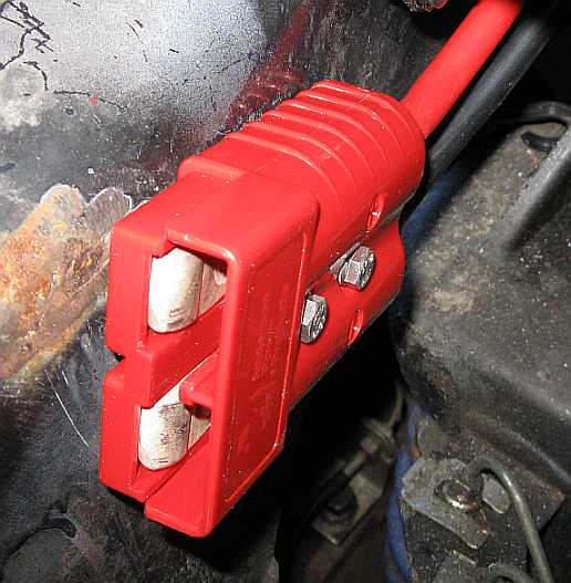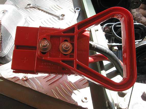 Damit die Seilwindenkabel an der Seilwinde steckbar sind, sind Anderson-Stecker an der Innenwand des rechten Kotflügels montiert. Die Version SB350 (11cm lang) ist für 350 Amp Dauerstrom geeignet, siehe Tipp Anderson-Batteriestecker. Ein Trennschalter für die Seilwinde ist dann nicht mehr notwendig. |