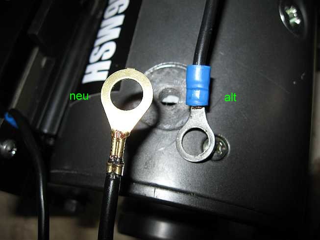 Am Masseanschluss am Motor der HSW9500 wird auf der Metallfläche die restliche Farbe entfernt und gefettet. Mit einer guten Crimpzange (3. Bild, rechte Zange) wird eine neue Ringöse aufgepresst. Zusätzlich kann man wegen des Geländeeinsatzes ja noch die Crimpung verlöten. Die Metallfläche um das Gewindeloch wird vor dem Einbau einer neuen M8-V2A-Schraube gefettet, siehe auch Tipp Elektrik: Presszangen. |