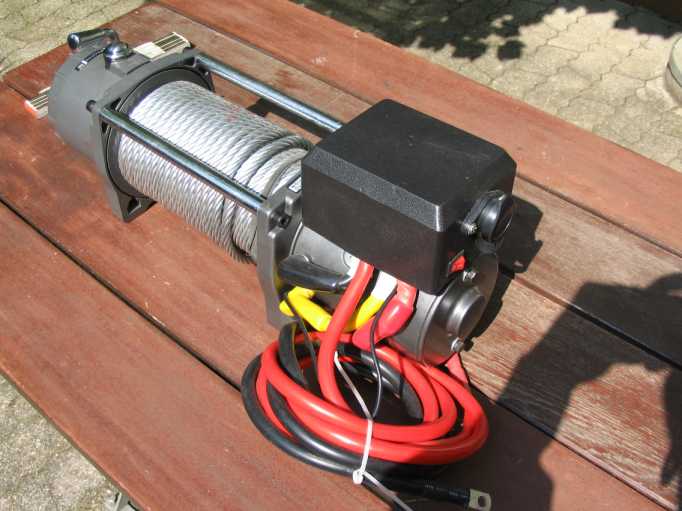 Zum Testen stellte mir im Frühjahr 2008 die Fa. Därr (München) die Winde HSW9500 zur Verfügung. Die Winde besitzt die üblichen Merkmale: Freilaufkupplung, automatische Bremse und Fernbedienung. Optional sind Funkfernbedienung und Umlenkrolle erhältlich. Im Vergleich dazu die neue Fast Seilwinde HSW Q 9500. Die Zuggeschwindigkeit ist mit 15 m /min doppelt so hoch, bedingt aber auch eine höhere Stromstärke von 400 Amp.. |