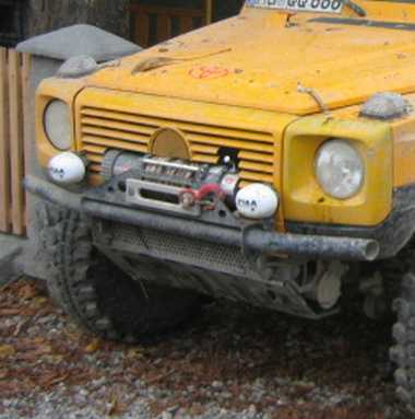 Auch der Anbau auf einer Stosstange wie bei einem G von der Alb ;) ist für die TAT geeignet, allerdings ist der Böschungswinkel durch Stosstange und Winde doch noch etwas verkleinert wie die Bilder zeigen. Ich setzte die Winde noch dichter an den Kühler, siehe u.a. im Abschnitt 4 Windenbock-Neubau. |