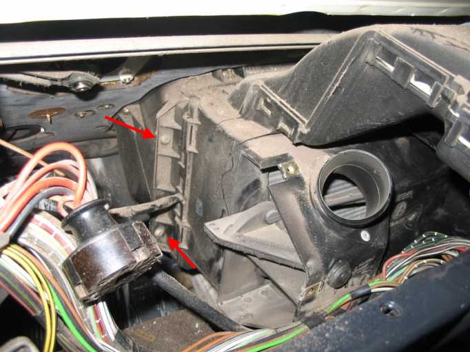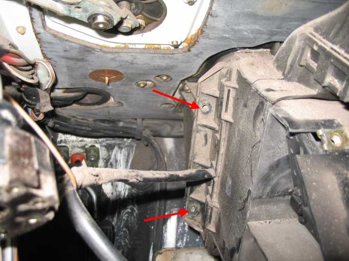 | Ist das obere Armaturenbrett ausgebaut, geht es am einfachsten. Der gesamte Gebläsekasten mit Wärmetauscher und Lüftermotor ist auf beiden Seiten mit je zwei Kreuzschlitzschrauben befestigt. | ![]() |