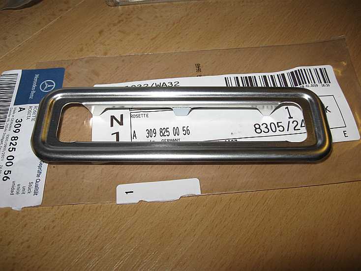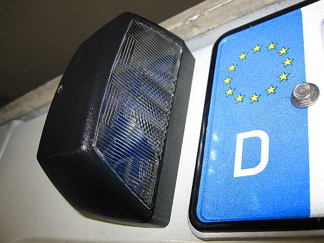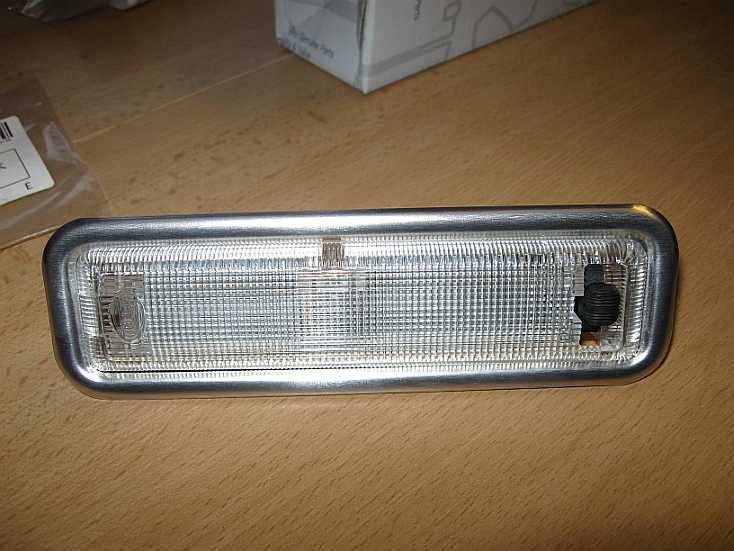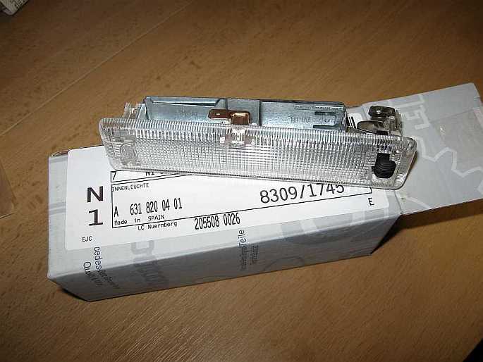 Da der Ausschnitt für die originale Beleuchtung so ohne Lampe oben im Scheibenrahmen auch nicht schön ist, habe ich die originale Leuchte (A6318200401) wieder eingebaut.