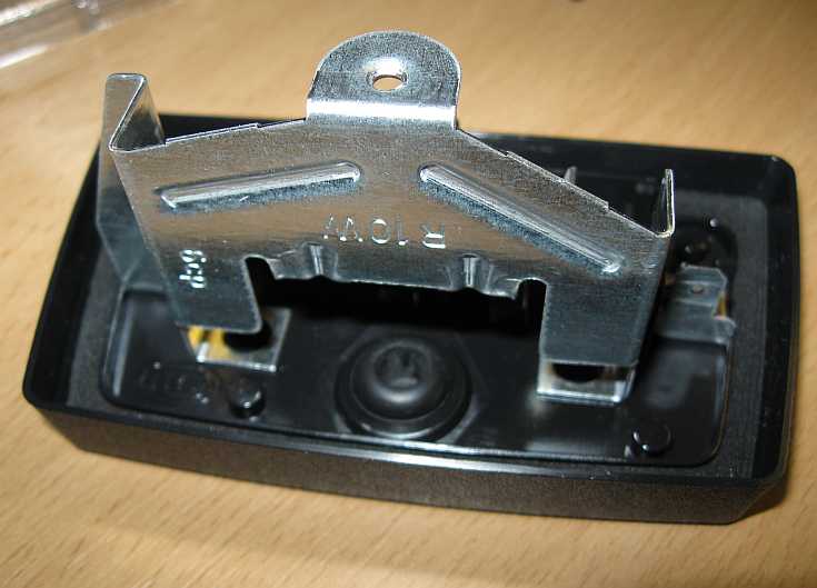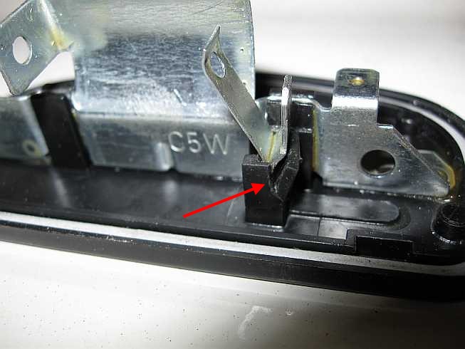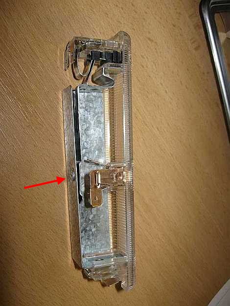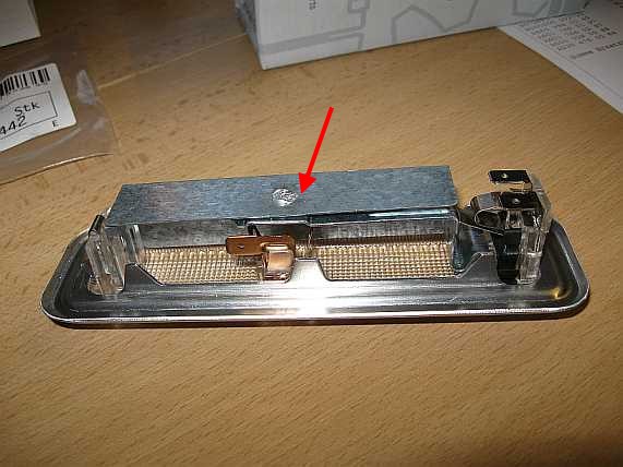 Im Unterschied zu der früheren Ausführung (siehe 240GD) hat die neue Leuchte einen rückwärtigen Blechteil (roter Pfeil) zusätzlich. Dieser ist unbrauchbar und behindert die Anschlüsse. Also habe ich das Blech entfernt. |