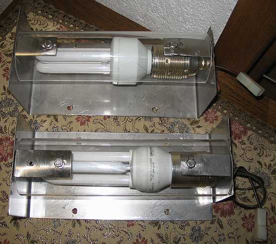 12 Volt-Energiesparlampe, Lichtleistung einer 75 Watt-Glühbirne (230V), die aber nur etwas über 1 Ampere Strom (15 Watt) verbraucht (Fa. ELV, Nr. 6044103) und einen normalen E27-Schraubsockel besitzt. |