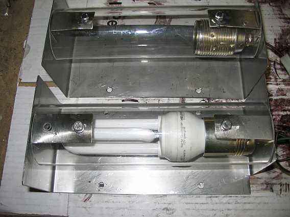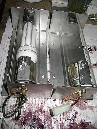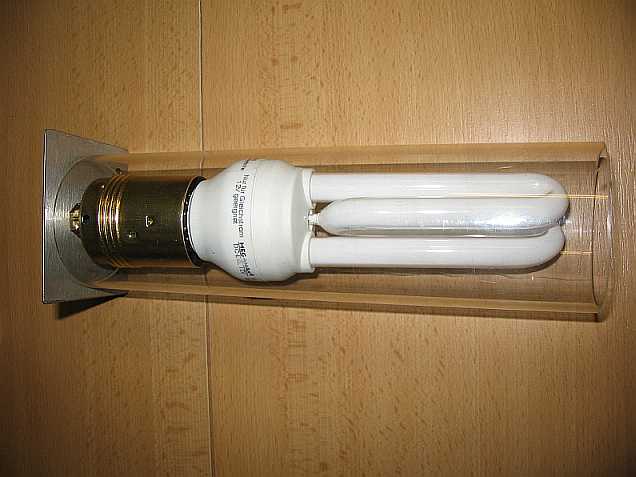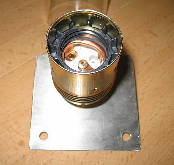 | Eine 230V-Glühbirnenfassung wird an einen Winkel geschraubt (Teile gibt es im Elektroladen). Ein Stück Plexiglasrohr (Baumarkt) dient als Schutz der zerbrechlichen Lampe. | ![]() |