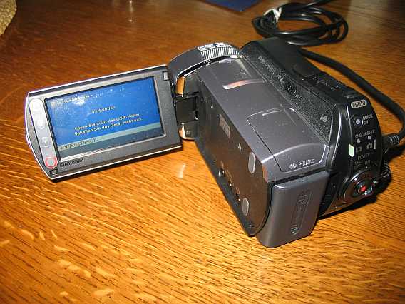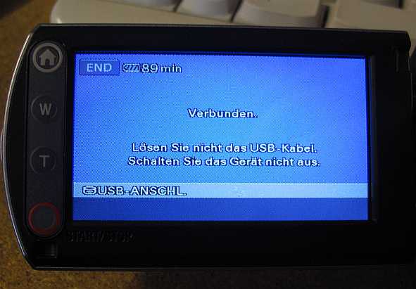 | Der eingeschaltete Camcorder muss über USB an den PC angeschlossen sein. Über den Bildschirm des Camcorders wird die USB-verbindung ausgewählt. | ![]() |