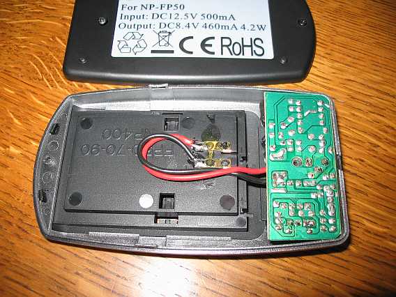 | Eine interne Ladeschaltung liefert 8,4 V für den Lithiumakku. Die Leuchtdiode wechselt von rot nach grün, wenn der Akku geladen ist. An den Kontakten des Adapters für den Akku sind 8,48 V messbar. | ![]() |