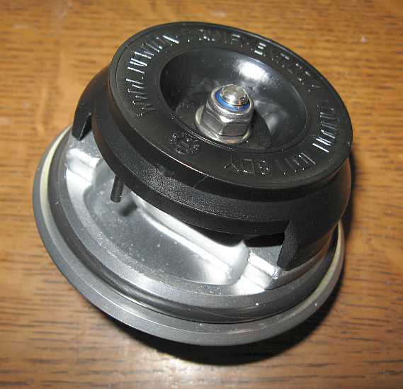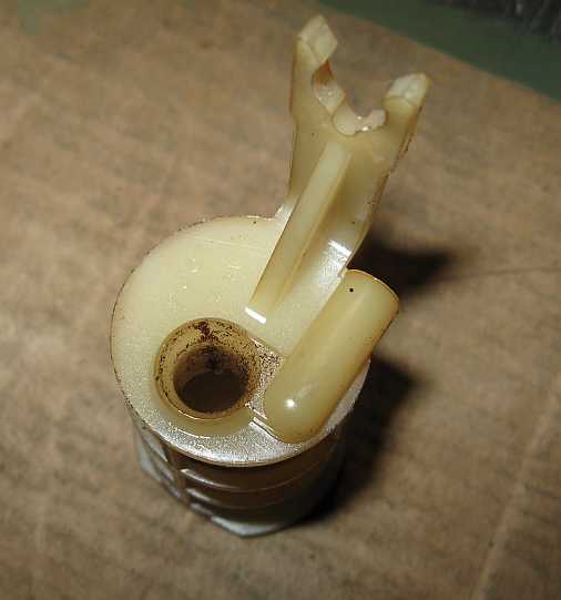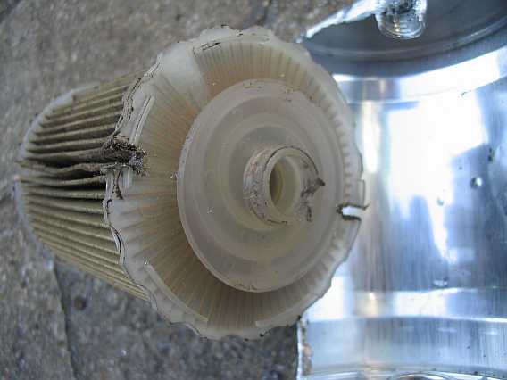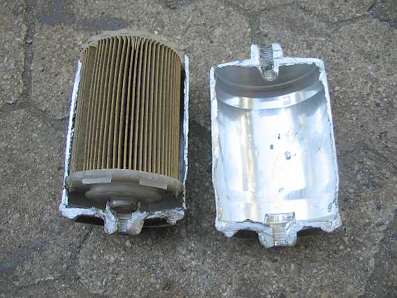 | Der Zulauf im Benzinfilter (Knecht KL19) erfolgt über eine spiralförmige Nut, damit das Benzin radial über die ganze Filterfläche strömen kann. | ![]() |