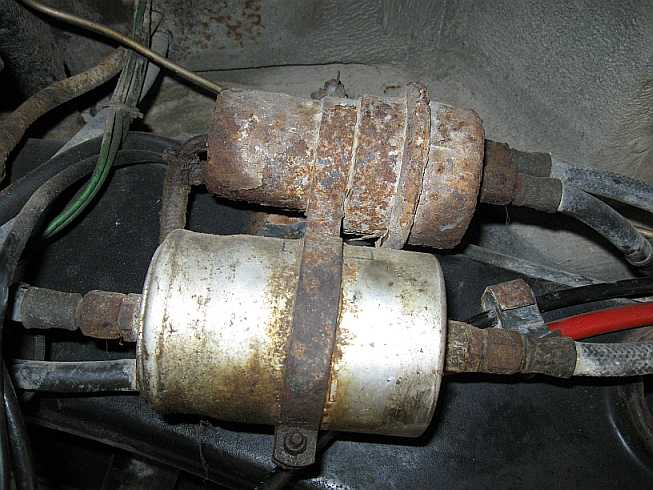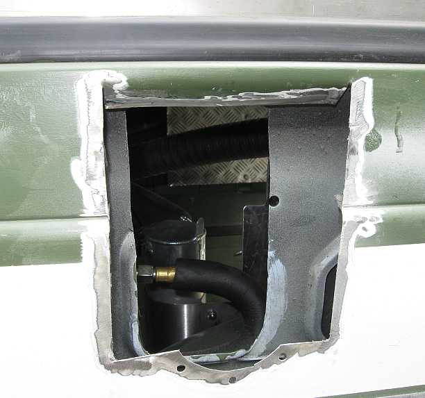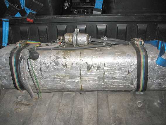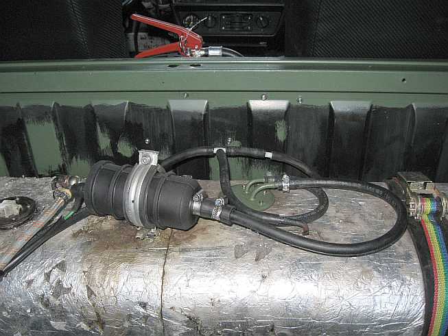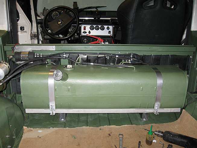 Übersicht: ![]() Die Vorbesitzer hatten in den 280GE einen 65-Liter-Innentank hinter der Trennwand mit Toyota-Tankgeber, Entlüftungsleitungen, Ansaugstutzen mit Filter und Benzinpumpe eingebaut. |