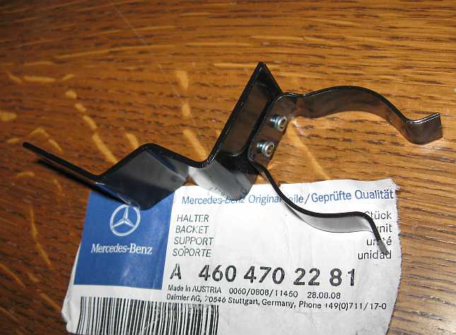 | Der Halter ist ab Werk mittels Gummipuffer (A1179880111 - 2,87 Euro ohne MwSt.) unten am linken Rahmenlängsholm befestigt. Dieser Montageort ist rostgefährdet, vor allem im Gelände. | ![]() |