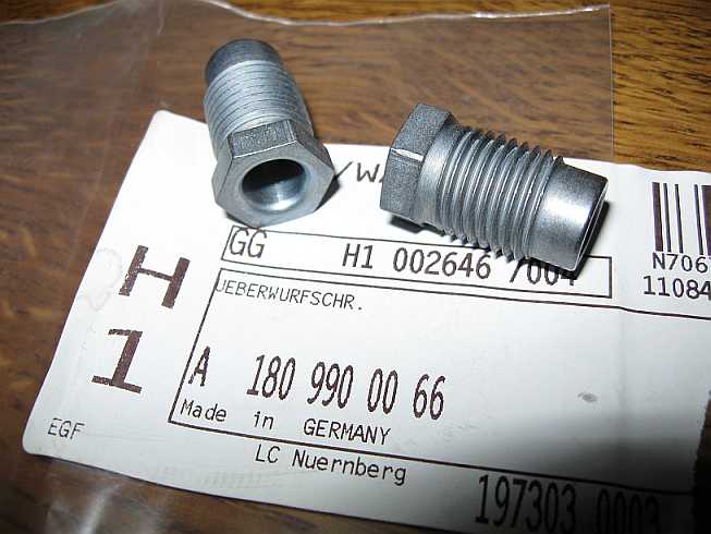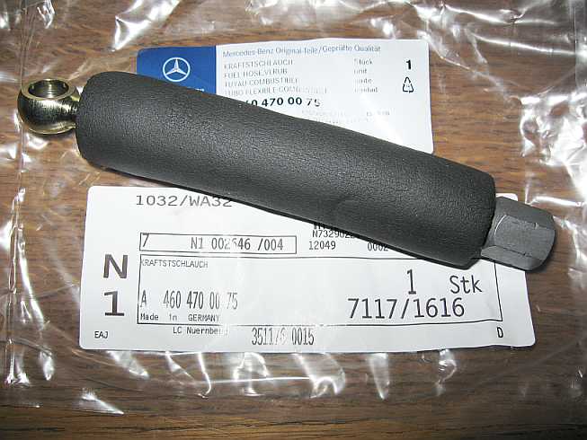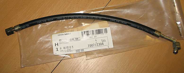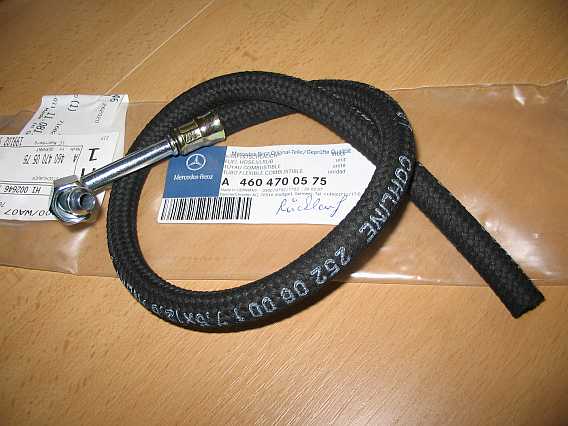 ![]() Teile / Anschlussstücke KA-Jetronic sind hier im Tipp 98-24-2, Abschnitt 11. Der Schlauch A4604700275 - 32,24 Euro ohne MwSt. ist am Dämpfer angeschlossen und führt zum Motor (Vorlauf). Das gebogene Anschlussstück hat die Überwurfmutter M14x1,5 und den Außenkegel 60 Grad. Auf der anderen Seite ist am Schlauch (COHLINE-3024, 0800-8x14, Aufdruck: Schlauch nicht knicken!) die Verschraubung M14x1,5 - Innengewinde) fest aufgepresst. |