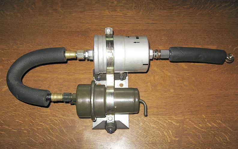 | Bei Schräglage und bei zu wenig Benzin im Tank wird ja Luft angesaugt. Das verhindert ein Catchtank Nr. 5657-0 mit vier Rohranschlüssen. Es ist ein kleiner Aluminium-Zusatztank (etwa 1 Liter Inhalt), der unabhängig von der Schräglage verhindert, dass von der Benzinpumpe Luft angesaugt wird. Es gibt ihn für 69 Euro bei der Fa. Isa-racing.de. Diese Firma zeichnet sich durch schnelle Lieferung und kompetente Hotline (Technik) aus, absolut empfehlenswert! | ![]() |