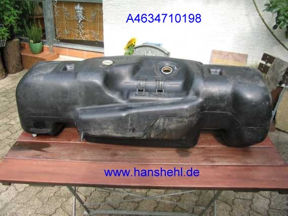 | Leider hat der Tank keine inneren Schwallwände. Bei geringer Benzinmenge und Schräglage wird Luft von der Benzinpumpe angesaugt. Eventuell wird der Tank durch einen vorhandenen Kunststofftank A4634710198 vom 463 ersetzt (siehe Bericht Kunststofftank), der einen Innentopf besitzt. Dazu würden noch das Kraftstoffsieb, der Tankgeber und der Einfüllstutzen benötigt. Oder besser, einen zusätzlichen Catchtank einbauen. | ![]() |