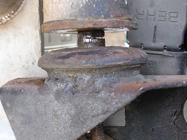 | Vor dem Abbau des Radeinbaubleches muss die Aufbaulagerung abgebaut werden. Der untere Pufferteller ist wie auf der rechten Seite auch abgerostet. Mit der Flex werden Abstandsrohr und Schraube durchtrennt, da sie im Alu festgefressen ist (siehe auch "Aufbaulagerung". | ![]() |