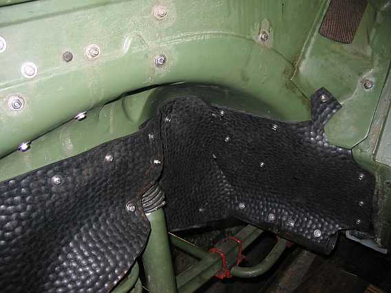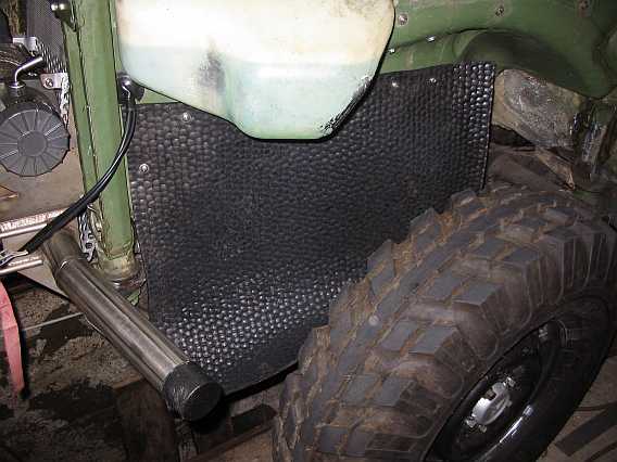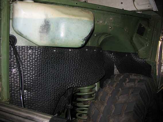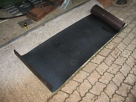 Aus einer 5 mm dicken Gummimatte (9,5 Kg - 54,26 inkl. MwSt.) habe ich im Juni 2010 einen Schmutz/Spritzschutz in den vorderen Kotflügeln gebaut. Einzelne Abschnitte sind mit dicken V2A-Blechschrauben befestigt. So ist auf der linken Motorseite der Warmlaufregler zugänglich, ohne dass man alles abschrauben muss. |