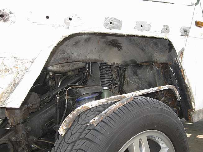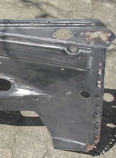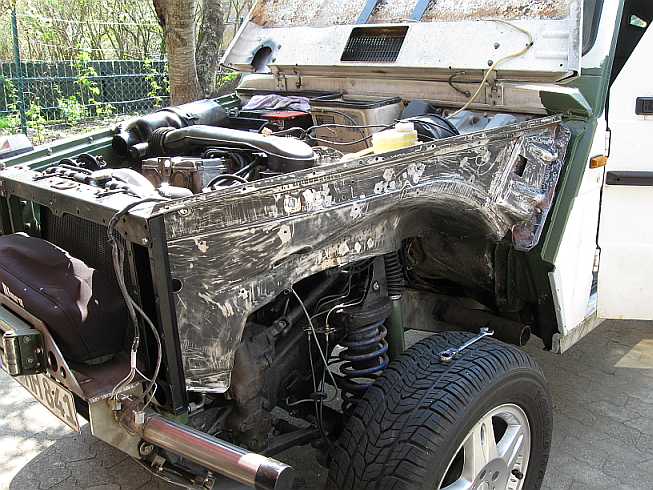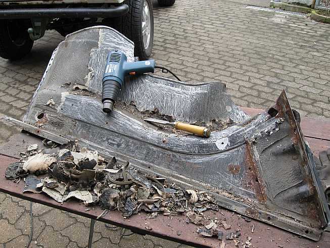 | Die meiste Arbeit ist das Entfernen des alten, verhärteten PVC-Unterbodenschutzes mit dem Heißluftföhn (Bild: rechter Kotflügel). Das Radeinbaublech wird vor dem Lackieren geschliffen. | ![]() |