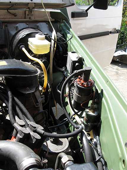 | Bei der Restauration von Kotflügel und Radeinbaublech vorne links kann ich mich kurz fassen, da vieles beim Kotflügel vorne rechts beschrieben ist. Nur die Besonderheiten sollen hier aufgezeigt werden. Zündung, KA-Jetronic, Öldruckschalter und Scheibenwaschanlage sind bei abgebautem Kotflügel leichter zugänglich. |