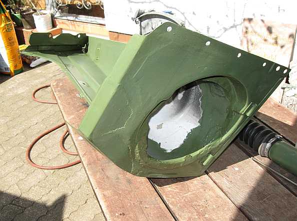 Die obere Kotflügelmutter an der Spritzwand widersetzte sich allen Lösebemühungen. Vom Rost war die Mutter gerundet. Erst nachdem ich die Mutter mit kleiner Schweißbrennerflamme an einer Seite bis zur Rotglut erwärmte, konnte sie mit einem scharfen Meissel und Hammer abgeschraubt werden. Eine Serviceöffnung oben am Kotflügel erleichtert in Zukunft den Abbau des Kotflügels. |