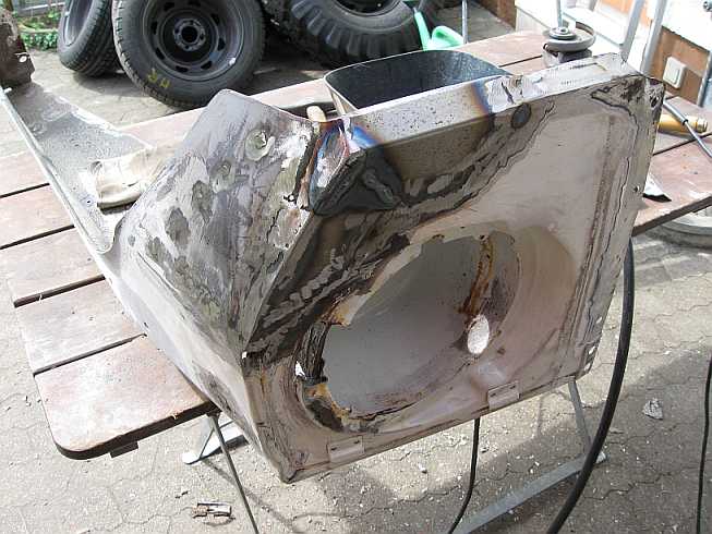 Die weggeschnittenen Teile müssen nicht entrostet werden. Auch von der Kotflügelverbreiterung kann ein Teil weg. |