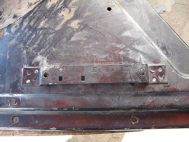 Unten an der Säule (auf der Innenseite) ist das Radeinbaublech fast durchgerostet. Die Säule wird abgetrennt (Punktschweißstellen ausfräsen). Die verrostete untere Ecke des Radeinbaublechs habe ich einfach abgeschrägt. Da das Radeinbaublech an die Säule angeschraubt wird, kann jedes zweite Loch zugeschweißt (Kupferblech unterlegen) werden. Oben wird ein Blechstück eingesetzt.