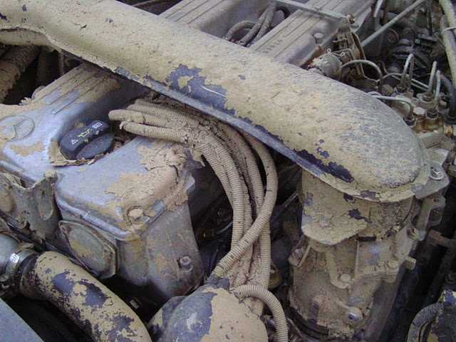| Bei der Tranilvania-Trophy 2009 war der Motorraum mit Schlamm verdreckt. Er konnte seitlich zwischen Rahmen und Spritzwand zum Motor gelangen.