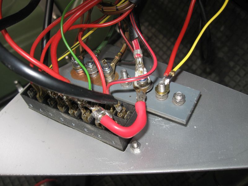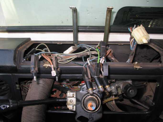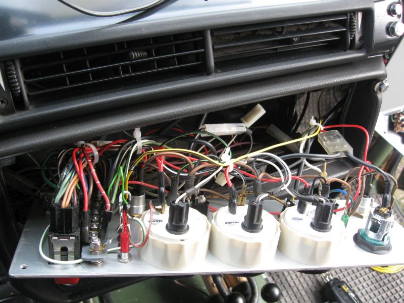 | Das 3. Bild zeigt die Probeverdrahtung. Eine eigene Masseleitung führt zum zentralen Massepunkt links vom Lenkrad. Die Leitungen zur Schalttafel sind gesteckt, ein Ausbau ist schnell durchgeführt: Vorhanden sind Öldrucksensor, Temperatursensor, Beleuchtung, 12V-Zündung (Zigarrenanzünder), 12V-Dauerplus (von Uhr), Masse, dreifach Steckdose Fernbedienung der Seilwinde. |