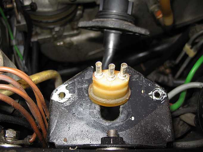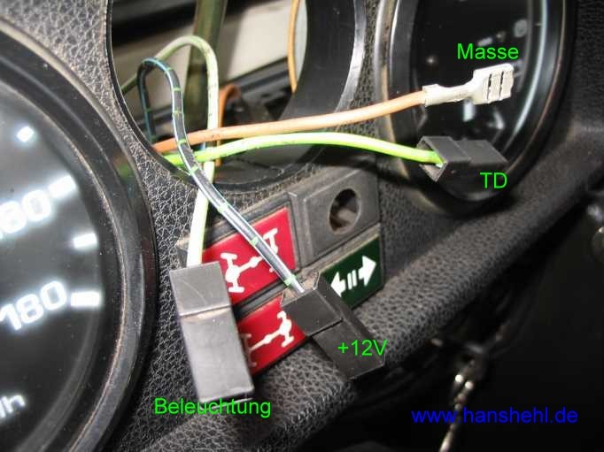 | Die Leitung TD (1-gn/ge) führt auch zum Kraftstoffpumpenrelais und zum 5-poligen Verbinder neben dem Zündgerät und zur Diagnosedose. Stellt man die Zündung mit einer Stroposkoplampe ein, ist es praktisch einen Drehzahlgeber in Sichtweite zu haben. Ein alter DZM kann direkt an der 5-poligen Schraubleiste oder an der Diagnosedose angeschlossen werden. |