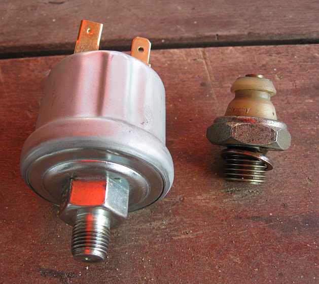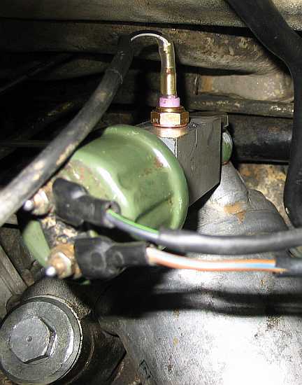 Öldruckmesser (Conrad Electronic) mit Geber 1/8-27 NPTF (mit Warnkontakt): Artikel-Nr. 842095-62. Für den Geber ist auf dem Ölfilter nach oben wegen der KA-Jetronik kein Platz, er muß mit einem Winkeladapter seitlich angeschraubt werden. |