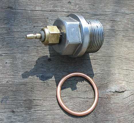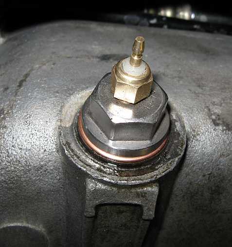 Da es keinen M26x1,5 - Temperatursensor/Geber wie damals beim 240GD mehr gibt, muß in eine Sechskant-Verschlussschraube mit Bund, M26x1,5 zyl. Feingewinde DIN 910, Stahl 5.8 verzinkt, ein passendes Gewinde (ich verwendete M10x1) für den Sensor geschnitten werden (Tipp von Carsten Günther: www.gclub-koeln.de). |