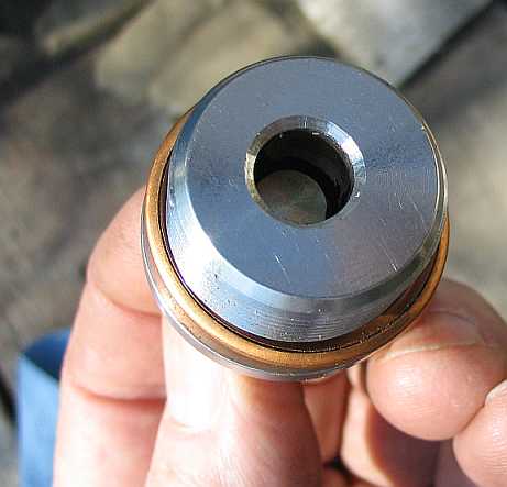 | Ein Messing-Bremsleitungsverbinder M10x1 passt auf den Druckgeber. Von einem M14x1,5-Schlauch-Winkeladapter (8 mm, Ringöse mit Hohlschraube) wird der Schlauchkonus abgesägt und an die Ringöse ein Bremsleitungsnippel M10x1 aus Stahl mit dem Sechskant angeschweißt. Ein Bremsleitungsbördel dient als Dichtung. Zusätzlich wird mit Teflonband abgedichtet. |