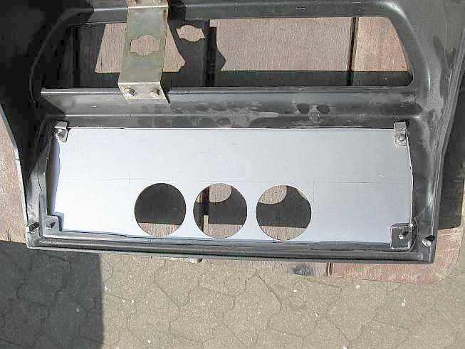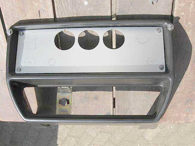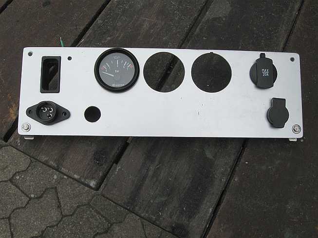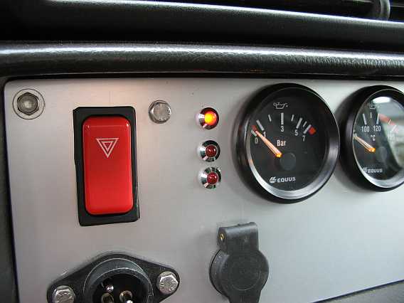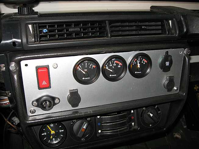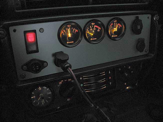 In der neuen Anzeigetafel des Armaturenbretts sind in der Mitte die drei Anzeigeinstrumente. Links daneben sitzt der Warnblinker. Darunter ist die Buchse für die Seilwindenfernbedienung eingebaut und eine Kfz-Steckdose (Klemme 15). Eine große Steckdose und eine Kfz-Steckdose bekommen Dauerplus. Die Anzeigeplatte ist über eine Steckleiste abklemmbar. |