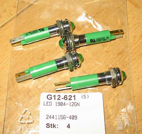 Es gibt bei Fa. Reichelt für das Armaturenbrett. 5mm LED-Signalleuchte in Glanzchromfassung, Bestell-Nr. 1904-12RT mit Aussenreflektor. Farbe: rot, Einbaudurchmesser: 8 mm, 4,5 mcd mit Vorwiderstand zum direkten Anschluss an die Versorgungsspannung, Anschluss: über 2,0/2,8mm Fastkontakt oder vorsichtiges Löten. Anode (+): Steckkontakt Messing, Kathode (-): Steckkontakt verzinnt. Vorgesehen sind eine Anzeige für die Benzinpumpe nach dem Kraftststoffpumpenrelais, Kl.87, Dauerplus Kl. 30 bzw. Seilwinde. Die LED gibt es auch grünleuchtend. |